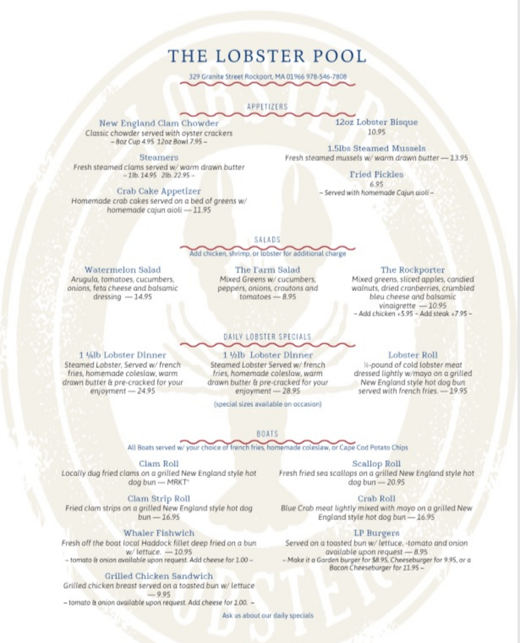 Rockport ma 01966 claim this business. 230 reviews of the lobster pool one of our favorite stops with out of town guests or on an afternoon excursion. The lobster pool is now open thursday sunday s 11 30 8pm. 329 granite st show labels.